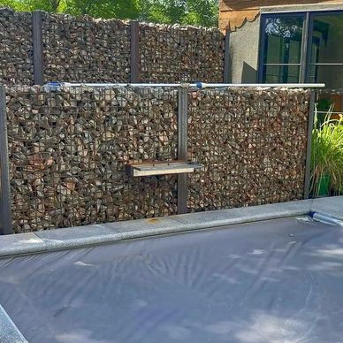 Baskets filled with rock and stacked atop one another to form a gravity- type wall. Gabions depend mainly on the interlocking of the individual stones and rocks within the wire mesh for internal stability, and their mass or weight to resist hydraulic and earth forces.